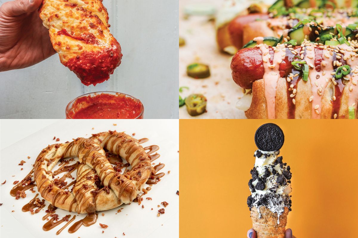 Menu items at the new concept include (clockwise from top left) stuffed, braided pretzels, the Sriracha Soul hot dog, Pretzel Chimney Cakes and a maple bacon topped pretzel.